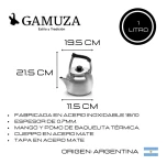 La pava Gamuza Platino de 1 litro es un clásico de la industria nacional argentina, fabricada en acero inoxidable 18/10 de alta calidad. A diferencia de la línea Boutique que utiliza madera, la línea Platino se caracteriza por un diseño sobrio con mango de baquelita negra resistente al calor.