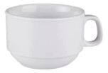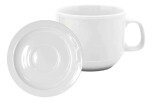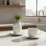 La taza de desayuno con plato de la línea Verbano Távola es una pieza de porcelana blanca argentina, ampliamente reconocida por su gran capacidad de 270 cc y su construcción robusta, ideal para el uso intensivo en el hogar o en establecimientos gastronómicos.